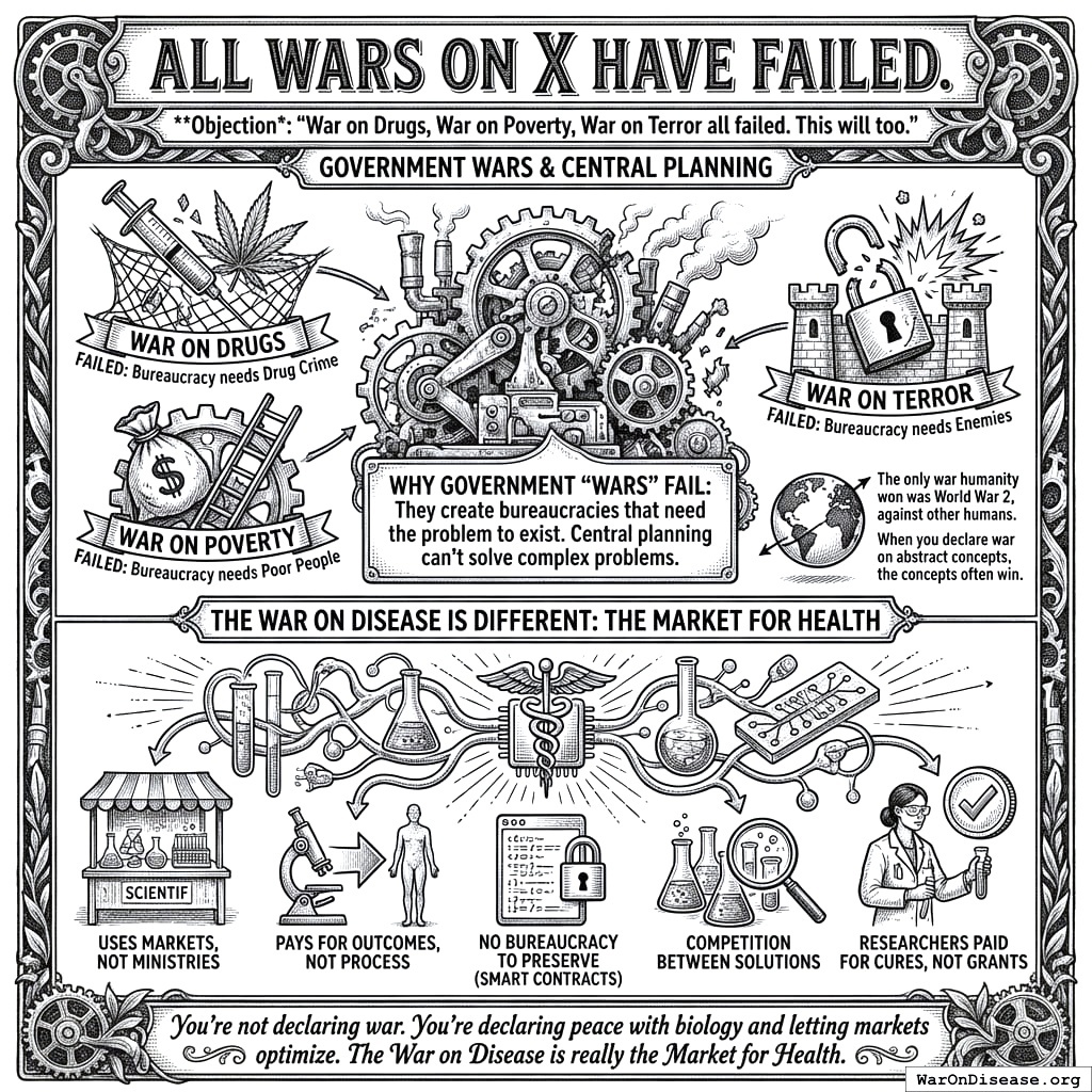 war-on-disease, 1-percent-treaty, medical-research, public-health, peace-dividend, decentralized-trials, dfda, dih, victory-bonds, health-economics, cost-benefit-analysis, clinical-trials, drug-development, regulatory-reform, military-spending, peace-economics, decentralized-governance, wishocracy, blockchain-governance, impact-investing