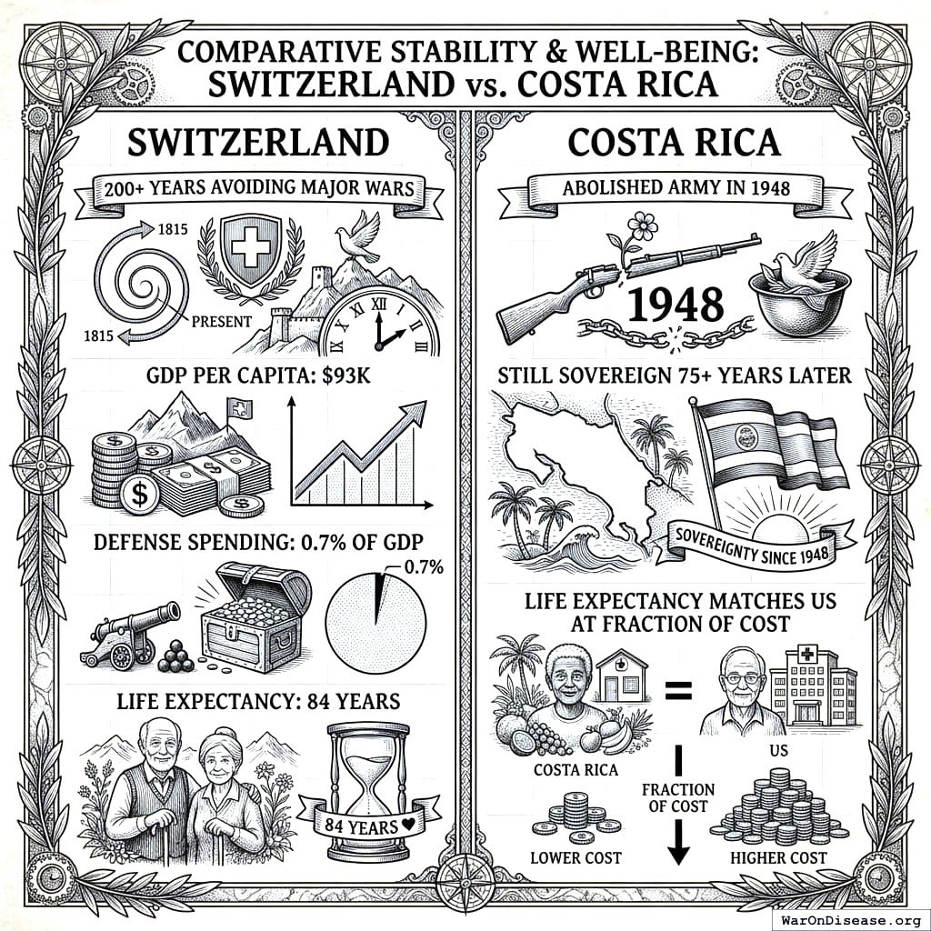 • Life expectancy: 84 years (6.5 years longer than Americans who spend 5x more on “defense”)