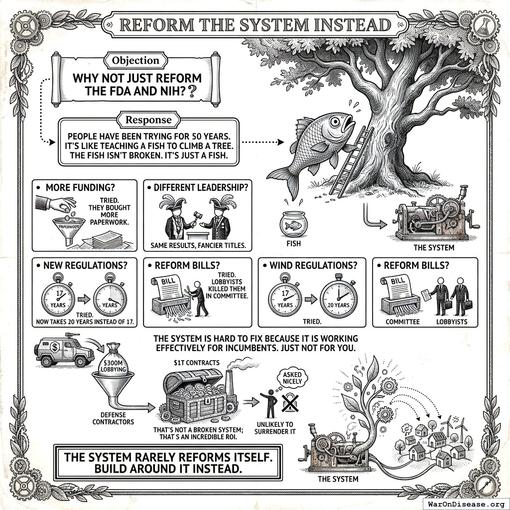 Objection: “Why not just reform the FDA and NIH? Or increase health funding without cutting military spending?”