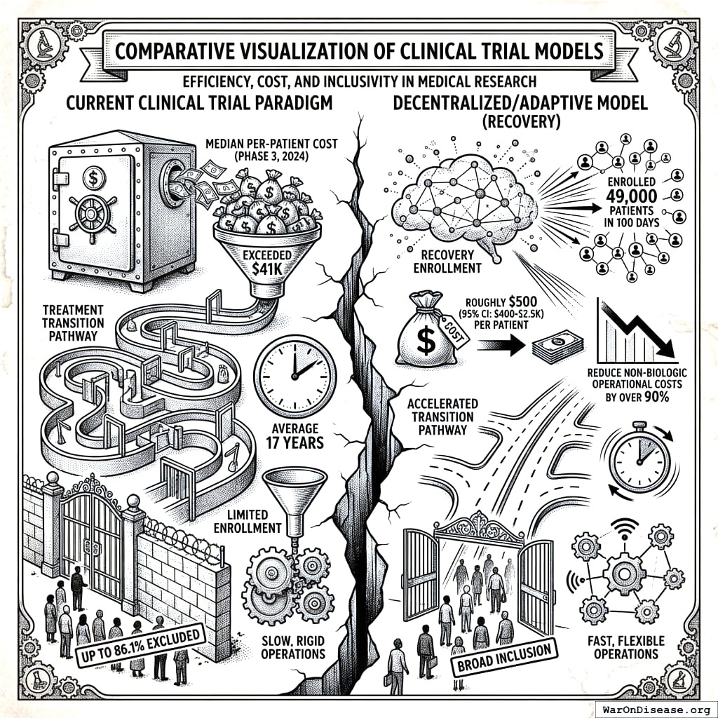 - The U.K. RECOVERY pragmatic trial enrolled 49,000 patients in 100 days at roughly $500[3], demonstrating that a decentralized, adaptive model can reduce the non-biologic operational costs of clinical research by over 90 percent through automation of data management, monitoring, and administrative functions.