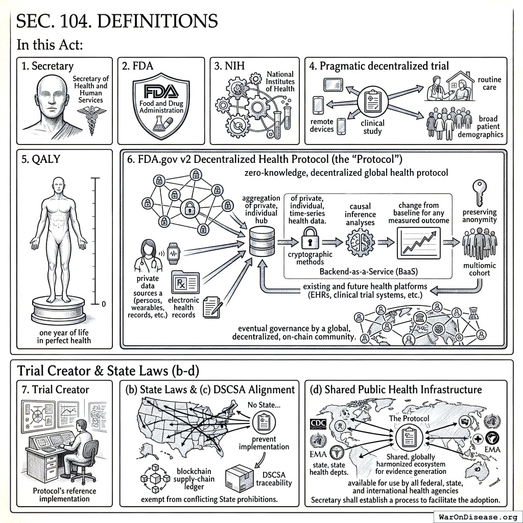 - FDA.gov v2 Decentralized Health Protocol (the “Protocol”) means the zero-knowledge, decentralized global health protocol initiated by the United States. Its primary function is to serve as a secure, open-source public utility that allows for the aggregation of private, individual, time-series health data. The Protocol is designed to perform and publish causal inference analyses on this aggregated data, showing the change from baseline for any measured outcome after any intervention for the multiomic cohort most similar to a given individual, while preserving the anonymity of all data contributors through cryptographic methods. It is intended to function as a Backend-as-a-Service (BaaS) with which existing and future health platforms (EHRs, clinical trial systems, etc.) can integrate, and is intended for eventual governance by a global, decentralized, on-chain community.