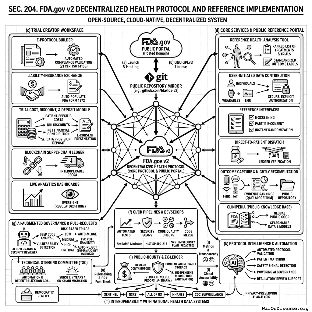 - The establishment of a global health data protocol, analogous to the foundational protocols of the internet, is necessary to securely connect disparate data silos and accelerate medical research worldwide. The FDA.gov v2 Decentralized Health Protocol is the United States’ initial contribution to this protocol, a public utility providing the secure, open-source backend for a new generation of health innovation. It creates a global public good by enabling research on all promising therapies, especially those without commercial potential that are underserved by private-sector research.