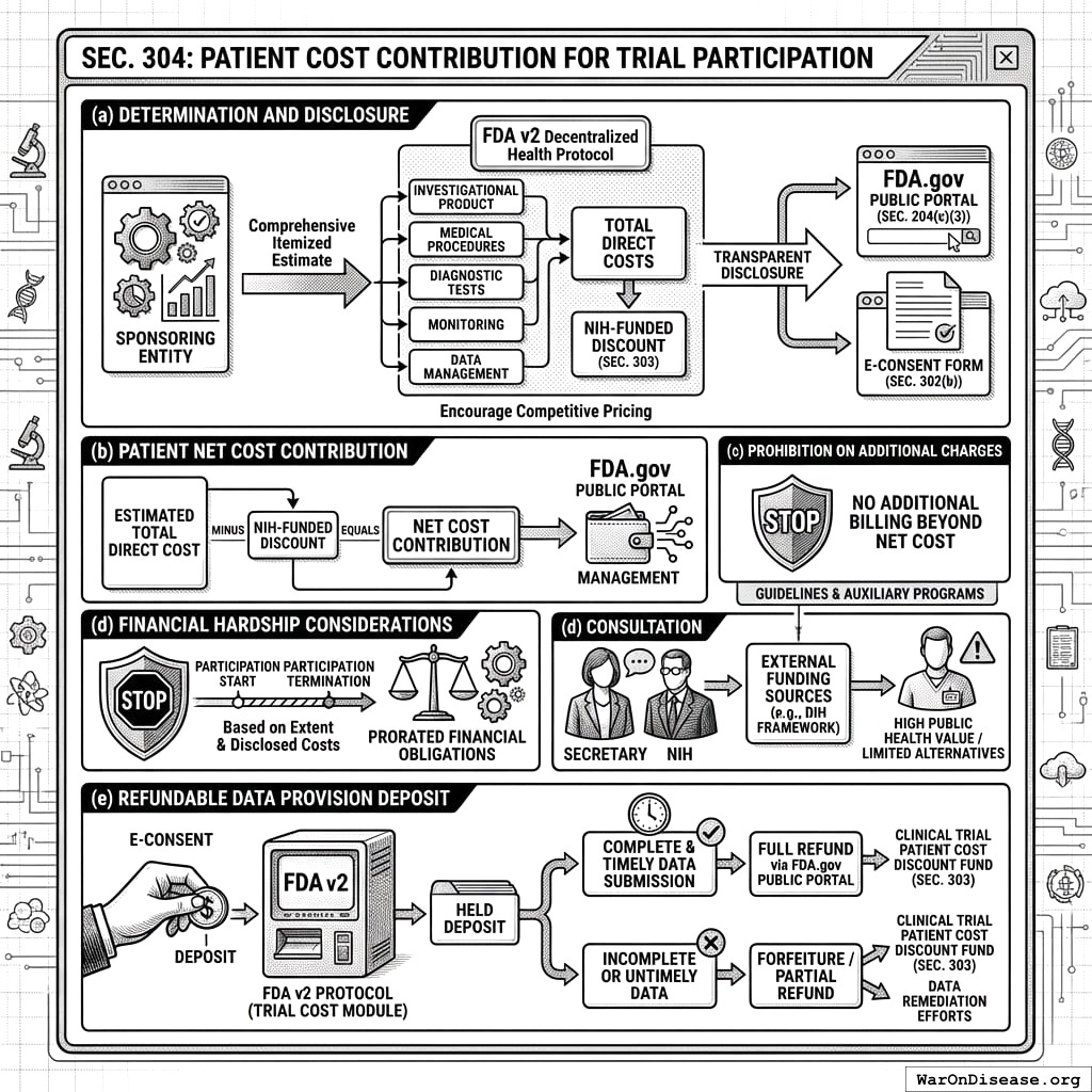 - Determination and Disclosure of Participation Costs. Prior to a patient consenting to a trial, the sponsoring entity shall determine and provide to the FDA v2 Decentralized Health Protocol a comprehensive, itemized estimate of all direct costs associated with that specific patient’s anticipated participation in the trial. This shall include, but not be limited to, costs of investigational product, necessary medical procedures, diagnostic tests, monitoring, and data management directly attributable to the research participant. These estimated costs, alongside the NIH-funded discount applicable under SEC. 303, and the final net cost to the patient, shall be transparently displayed to the potential participant via the FDA.gov Public Portal (SEC. 204(c)(3)) and detailed in the e-consent form (SEC. 302(b)). This transparent disclosure of itemized costs on a decentralized framework is intended to encourage competitive and efficient pricing by sponsoring entities.