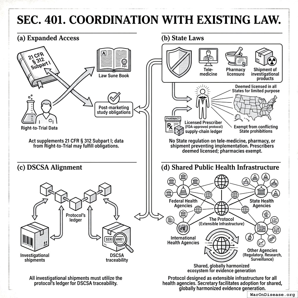 - State Laws. No State or political subdivision may regulate the practice of tele‑medicine, pharmacy licensure, or shipment of investigational products in a manner that prevents implementation of this Act. Specifically, a licensed prescriber participating under an FDA‑approved protocol shall be deemed licensed in all States for the limited purpose of providing investigational treatment under this Act, and pharmacies dispensing or shipping such products pursuant to the blockchain supply‑chain ledger are exempt from conflicting State prohibitions.