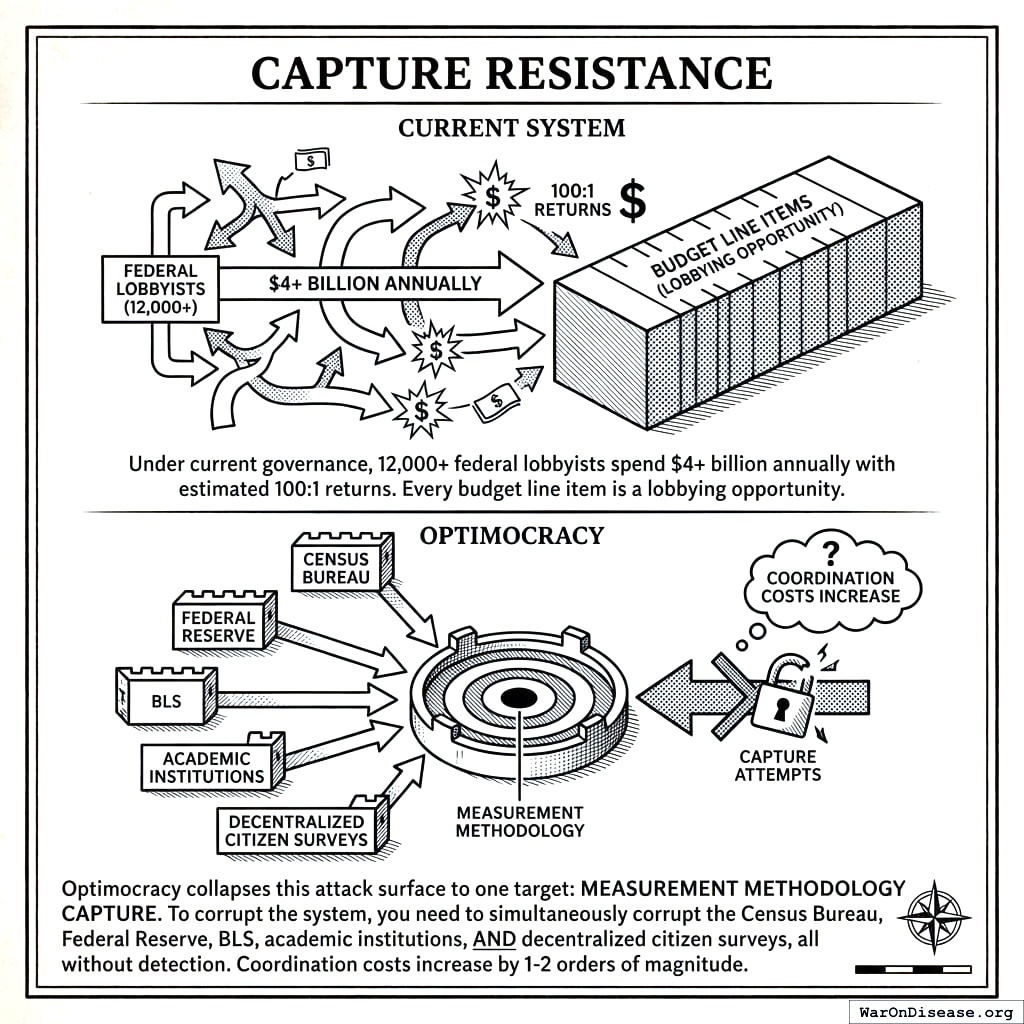 The Evidence Machine collapses all those capture points to a single target: the measurement methodology. Here’s the heist: simultaneously bribe the Census Bureau, the Federal Reserve, the Bureau of Labor Statistics, academic institutions, AND decentralized citizen surveys. All without detection. All at the same time. All institutions with different governance structures, different funding sources, different methodologies, and different reasons to hate each other. This is not a corruption strategy. This is the plot of a movie where the criminals lose.