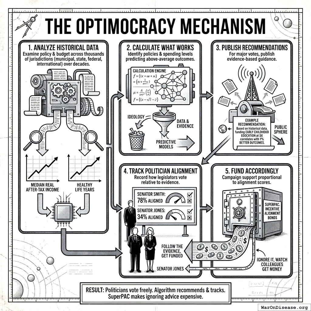10.5281/zenodo.18356213 Thousands of jurisdictions have made different policy and budget choices over decades, creating a natural experiment. Optimocracy applies causal inference to this cross-jurisdictional time-series data to identify which policies predict above-average median income and healthy life years. It then publishes evidence-based recommendations for every major vote, tracks politician alignment, and funds aligned candidates via SuperPAC, making suboptimal policy politically expensive while preserving democratic structures.