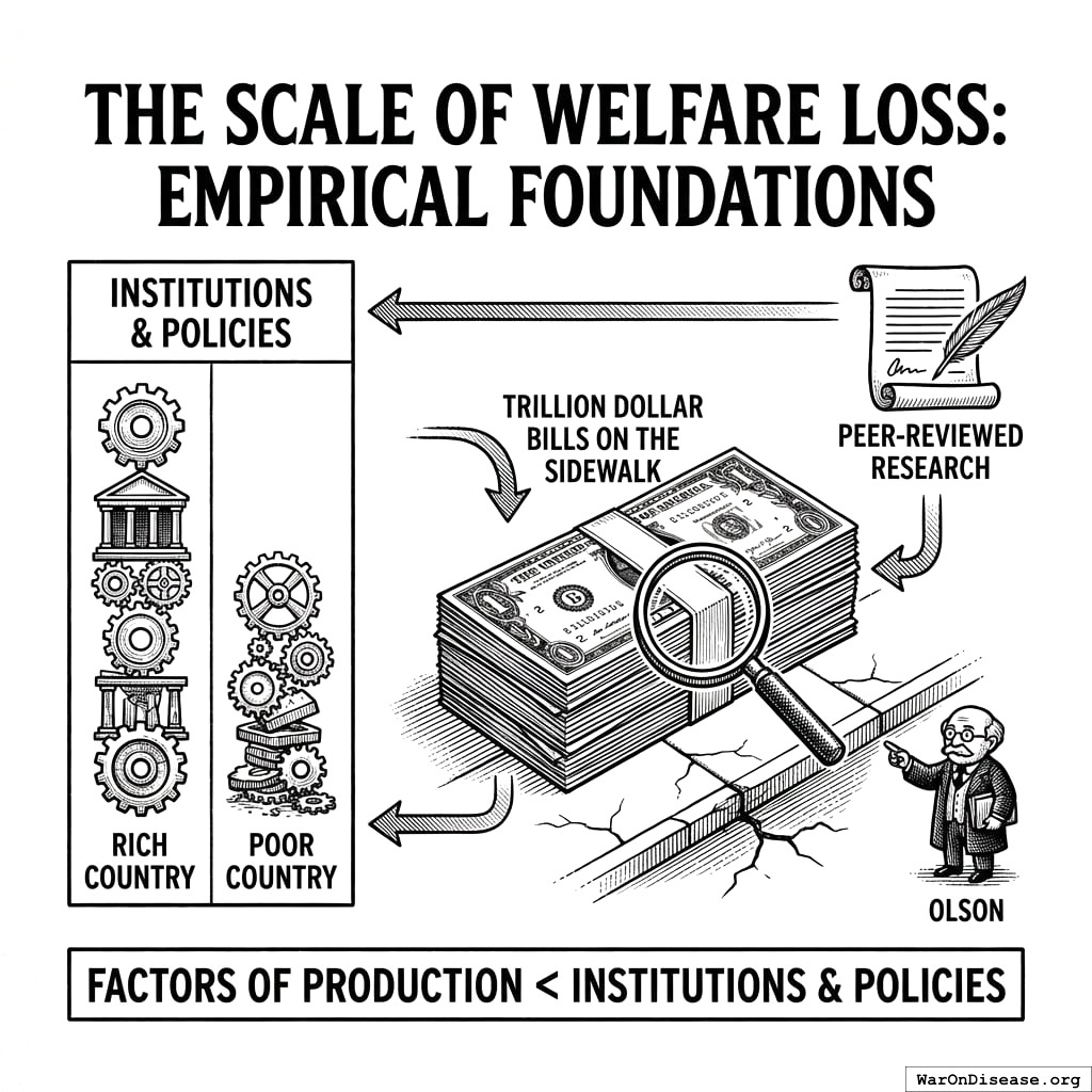 Documented US governance waste totals $4.9T (17% of GDP). Globally, the opportunity cost of suboptimal policy reaches $101T (87.8% of GDP), putting your civilization’s governance efficiency at 51.9%. Your species is running at roughly half its technological potential. Imagine building a car, then only turning on half the cylinders because the other half are controlled by a committee that meets once a year and disagrees about what “forward” means. (For the full accounting, see the Political Dysfunction Tax46 and US Efficiency Audit139.)