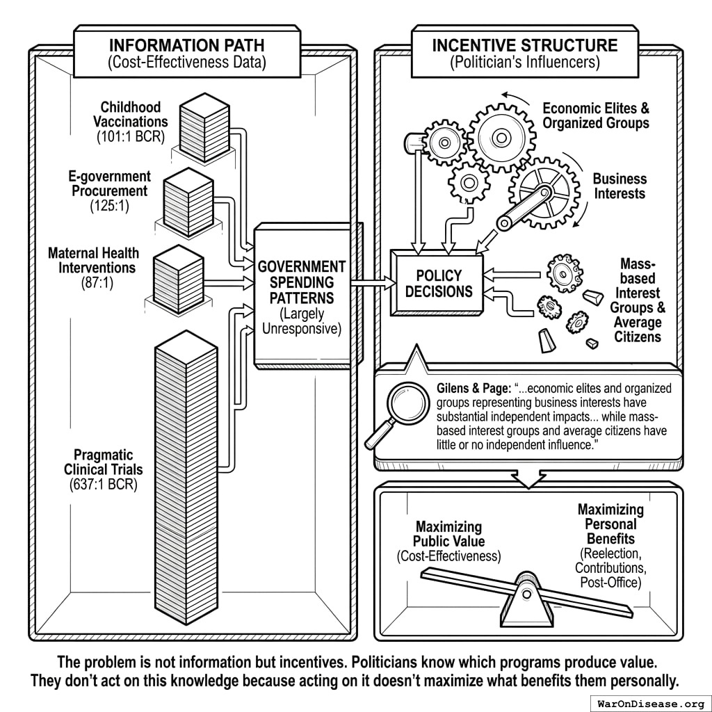 Why? Because information doesn’t change incentives. A Princeton study analyzed 1,779 policy decisions and found that average citizens have “little or no independent influence” on policy outcomes145. Economic elites and organized interest groups drive policy. You already knew this (it’s covered in Unrepresentative Democracy). The point here is that publishing better data doesn’t fix the problem. Your politicians already know which programs produce value. They don’t act because acting doesn’t maximize getting votes, getting papers, or getting a nice job afterward selling access to their replacements.